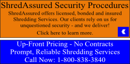 Please click here for more information, or give us a call at 1-800-838-3840 to find out how ShredAssured can help your company save money, protect its information, and comply with federal and state laws. Our client specialists are ready to assist and willing to help in any way they can.